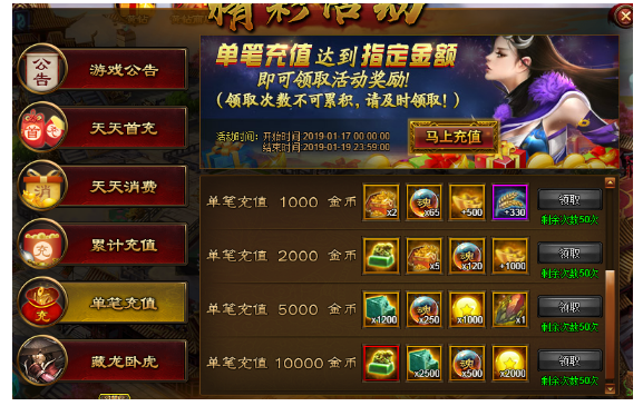 活动内容:活动期间单笔充值达到要求即可领取丰厚奖励。