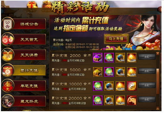 活动内容:活动期间累计充值达到指定金额即可领取丰厚奖励。