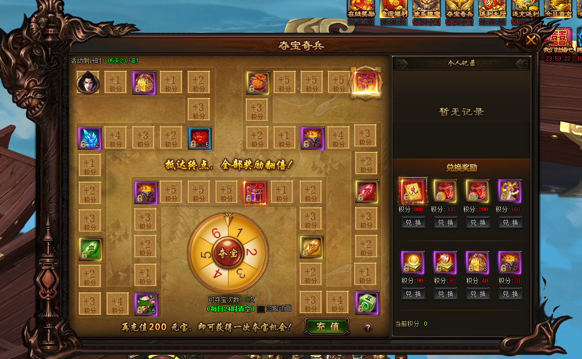 【活动内容】活动期间,玩家每充值200元宝即可获得一次转动轮盘的机会,开启夺宝的旅程!完成一次夺宝之旅,将获得翻倍的奖励,所得积分还能兑换传奇装备兑换券,装备精炼石及其他珍贵道具!