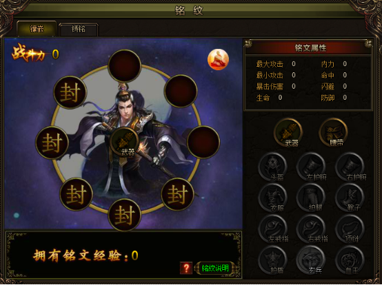 2) 铭纹镶嵌: 每个对应装备可装备8个铭纹,初始开放2件装备位。