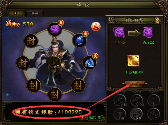 5) 铭纹升级:通过铭纹分解获得铭纹经验后,对主要的铭纹进行升级,最高等级15级。