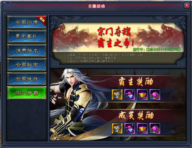 2.新增宗门争霸玩法,合服第一天,参与并夺得宗门夺旗战活动中的胜利,即可领取奖励一份