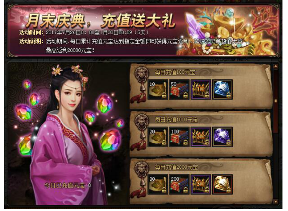 每日提取2000元宝以上可获得:藏宝图*30,如意宝匣*200,3阶神炉器灵盒*1,宠物天阶龙晶*1;
