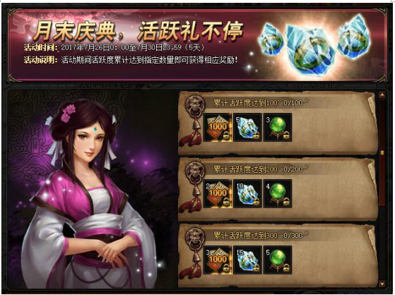 【活动内容】活动期间,每天通过活跃度界面完成各项活跃项目获得活跃度,整个活动期间活跃度累计达到指定数量即可获得相应奖励!