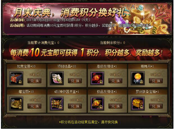 【活动内容】活动期间,每消费10元宝即可获得1积分,积分越多,奖励越多,超值大奖等你来兑换!