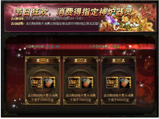 【活动内容】活动期间,每天消费达到指定排名即可领取相应排名奖励!