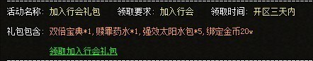 【活动内容】:只要玩家在开区3天内加入行会,即可领取行会大礼包。