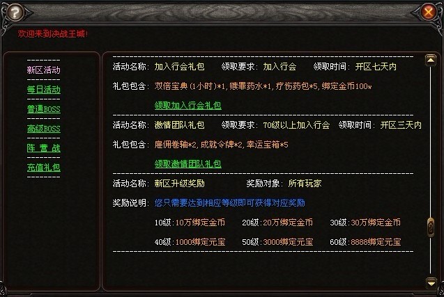 开服三天内等级达到70级并且有行会的玩家可以在新区活动页面点击领取!