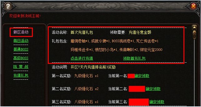 【领取方式】:充值成功后可前往沙漠之城【福利礼官】处领取充值大礼包