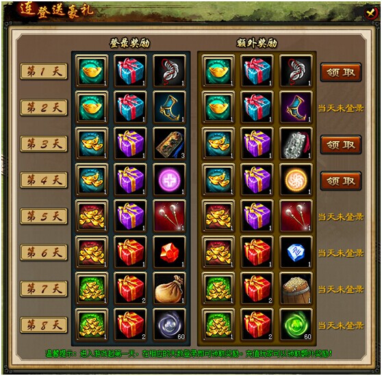 活动内容:在活动期间内,每天连续登录后即可在“八日连登”界面领取登陆礼包,领取后,在包裹中查看使用。充值玩家除了领取登录奖励外,还可以领取额外奖励。