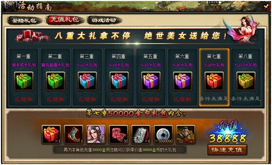 在活动期间内,无论充值多少金币,即可在“精彩活动”界面领取首充礼包一个,价值788元!领取后,在包裹中查看使用。