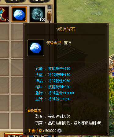单笔充值满5000金币,即可额外获得5级月光石*6;(月光神石镶嵌在武器上会增加将领的技能攻击技能攻击的强弱直接影响将领技能效果的强弱)
