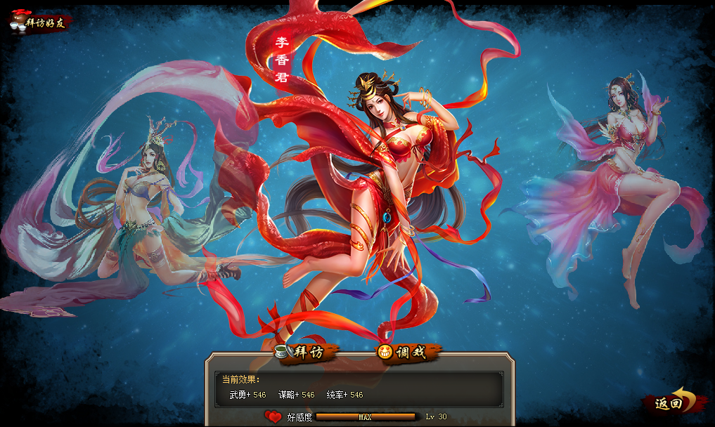 累计充值达到100000金币,即可获得:妖姬:李香君(增加统率,武勇,谋略),鲜花*500,银币*1000万,将魂碎片*42(统率,武勇,谋略的提高能够不仅能够增加士兵攻击、防御、生命力而且能增加将领的技能效果及怒气的回复)