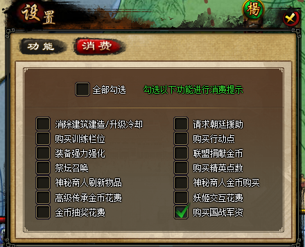 3. 在消费提醒设置中新增“购买军资提示”勾选,勾选后不再进行消费提示。