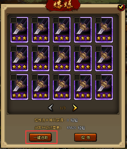 ² 神兵熔炼界面增加“一键选取”按钮,点击后选取神兵包裹中所有未被保护的神兵;