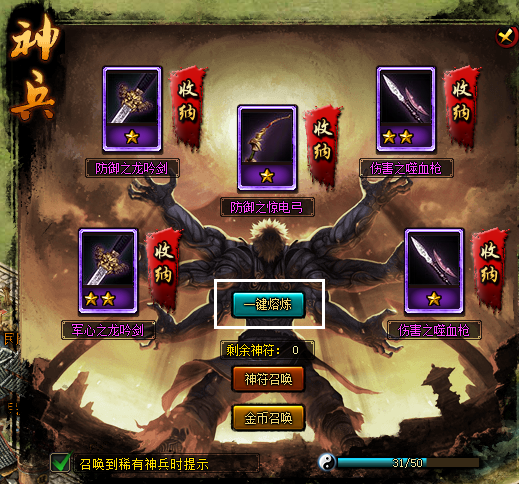 ² 神兵界面增加“一键熔炼”按钮,点击后神兵直接收纳所有神兵并熔炼转换成经验;