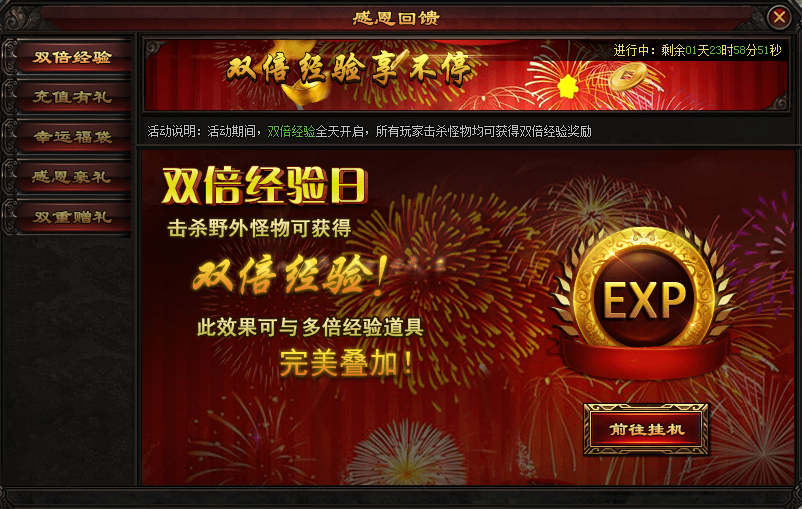 活动期间,双倍经验全天开启,所有玩家击杀怪物均可获得双倍经验奖励,还能与多倍经验道具完美叠加哦!