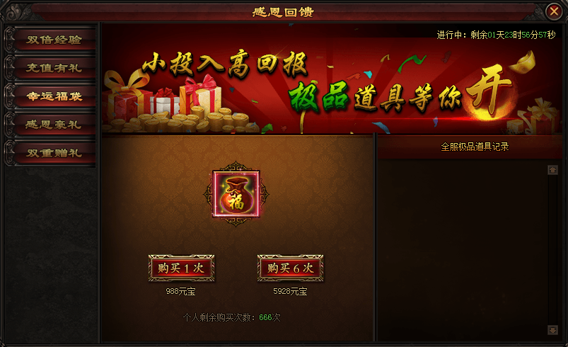 活动期间,玩家可花费少量元宝购买超值道具,机不可失,失不再来哦!