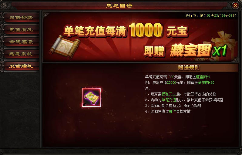 活动期间,每充值1000元宝即可获得藏宝图*1,多充多送,不计上限!