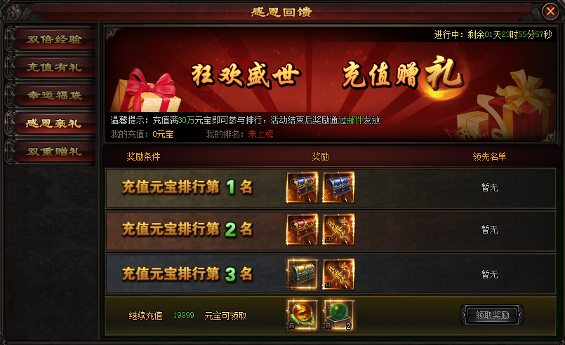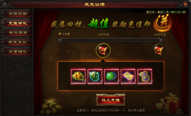 活动期间,充值指定金额的元宝,即可领取超值奖励回馈哦!