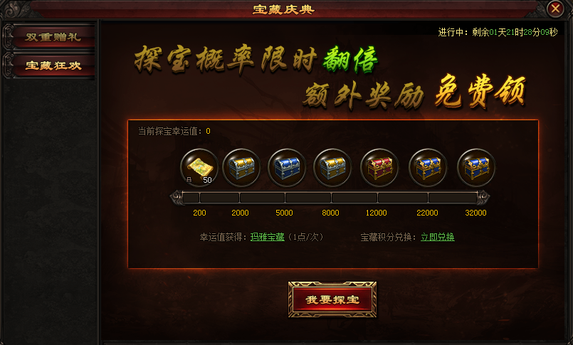 活动内容:抽取宝藏可获得幸运值,幸运值达到指定要求即可额外领取丰厚奖励!