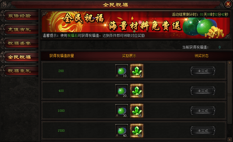 活动期间,获得祝福值达到一定数量,即可领取对应奖励