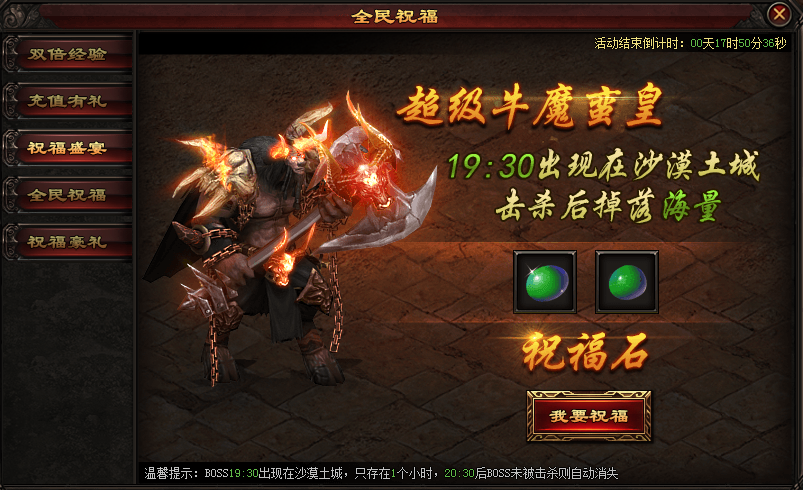 活动期间,每天晚上19:30将在沙漠土城刷新超级牛魔蛮皇,击杀后会掉落海量祝福石。