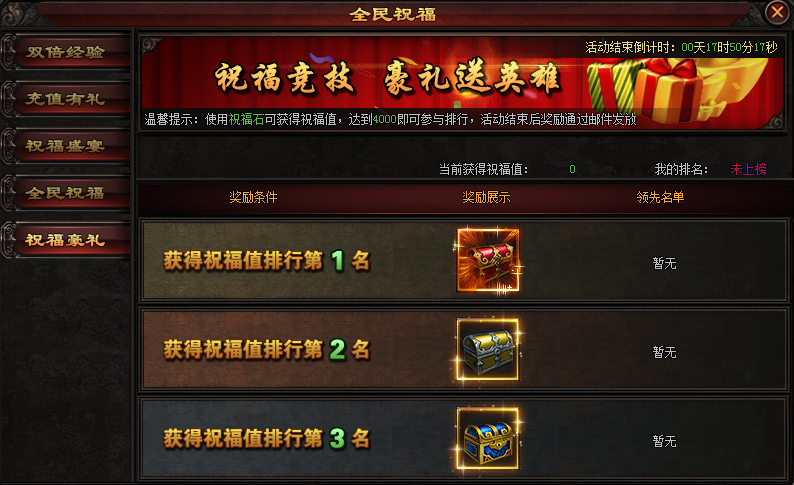 活动期间,获得祝福值达到4000以上即可参与排名,排名前三可以获得排名奖励