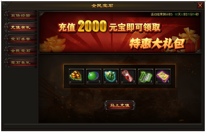 活动内容:活动期间,每天充值达到2000元宝即可领取对应礼包奖励。