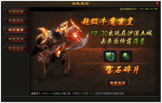 活动内容:活动期间,每天晚上19:30将在沙漠土城刷新超级牛魔蛮皇,击杀后会掉落海量宝石碎片。