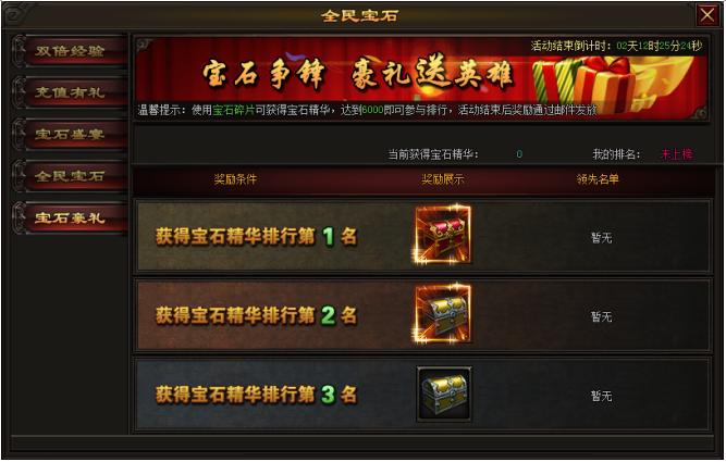 活动内容:活动期间,获得宝石碎片达到6000以上即可参与排名,排名前三可以获得排名奖励