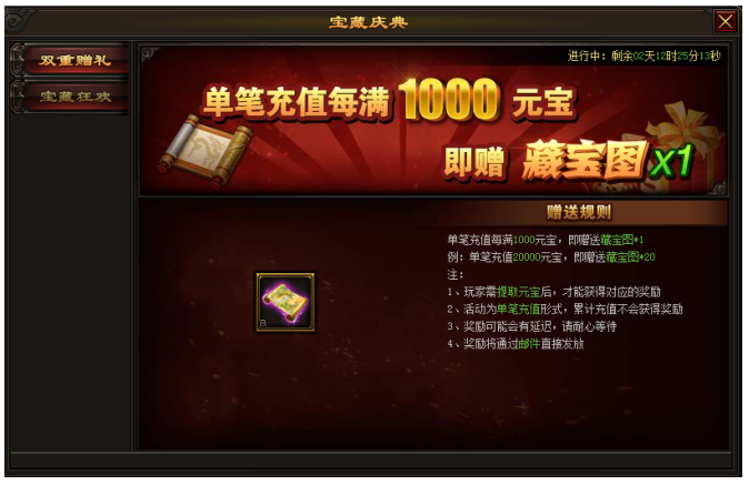 活动内容:每充值1000元宝即可获得藏宝图*1.多充多送哦!
