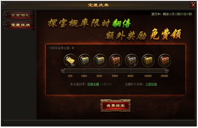 活动内容:抽取宝藏可获得幸运值,幸运值达到指定要求即可额外领取丰厚奖励!