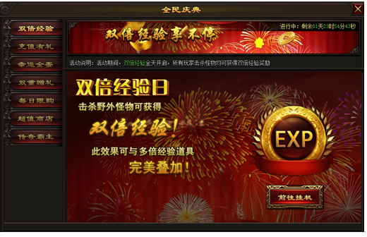 活动内容:活动期间,双倍经验全天开启,急速升级爽歪歪!