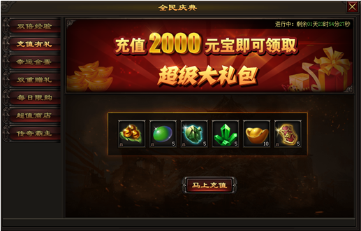 活动内容:活动期间,充值2000元宝即可领取超值奖励回馈。