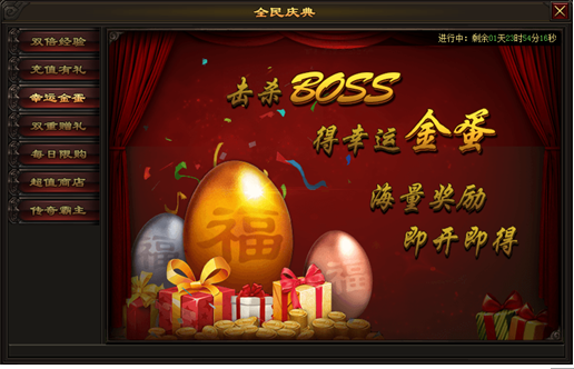 活动内容:击杀BOSS即有机会获得铜蛋、银蛋和金蛋,可开出诸多丰厚奖励额!