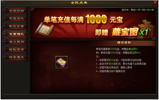 活动内容:活动期间,单笔充值每满1000元宝,即赠藏宝图*1,多充多送哦!