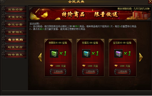活动内容:活动期间,每天都可以购买到超值折扣道具,机不可失!