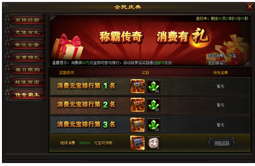 活动内容:活动期间,消费满30万元宝即可参与排行,活动结束后,奖励通过邮件发放。