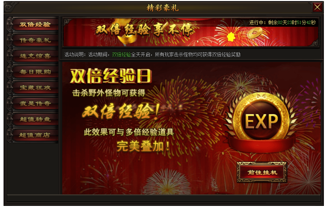 活动期间,双倍经验全天开启,所有玩家击杀怪物均可获得双倍经验奖励,还能与多倍经验道具完美叠加哦!