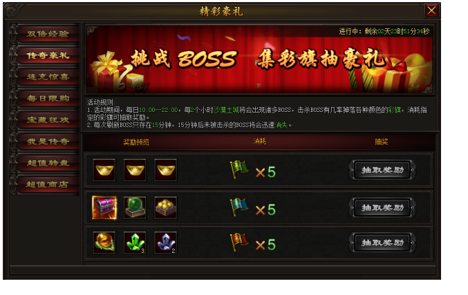 1. 活动期间,每日10:00~22:00,每2个小时沙漠土城将会出现诸多BOSS,击杀BOSS将有几率掉落各种颜色的彩旗,使用彩旗可抽取丰厚的奖励。