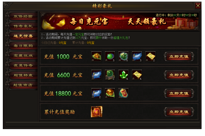 1. 活动期间,每天充值指定数量的元宝,即可领取对应的奖励回馈,即充即得。