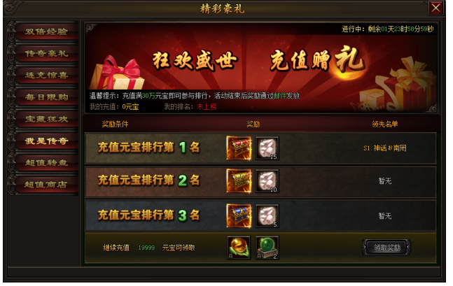 活动期间,累计充值达到30万元宝,即可参与充值排名,前三名可获得稀有装备奖励。