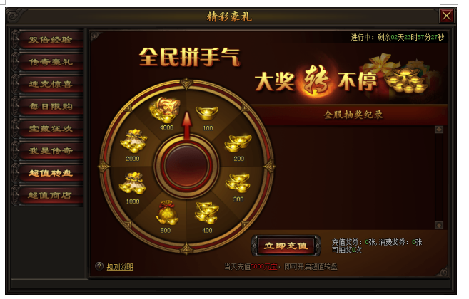 每充值2000元宝和消费2000元宝,都能分别获得1张充值奖券和消费奖券。