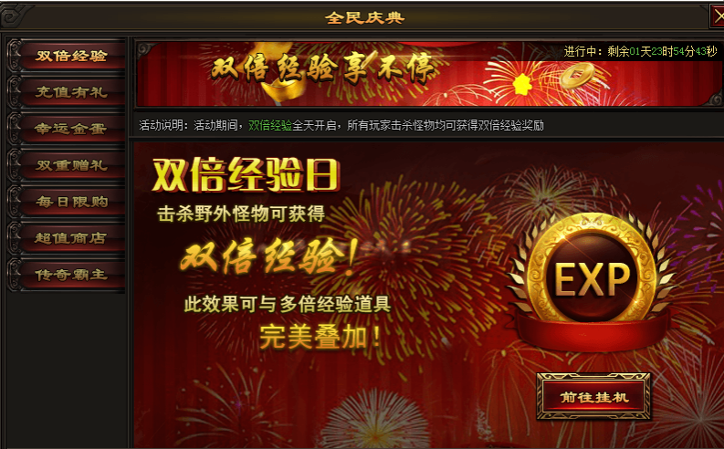 活动内容:活动期间,双倍经验全天开启,急速升级爽歪歪!