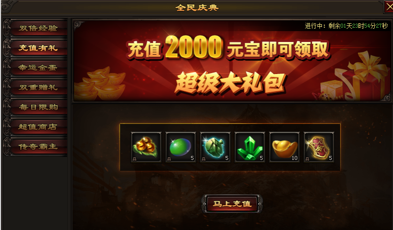 活动内容:活动期间,充值2000元宝即可领取超值奖励回馈。