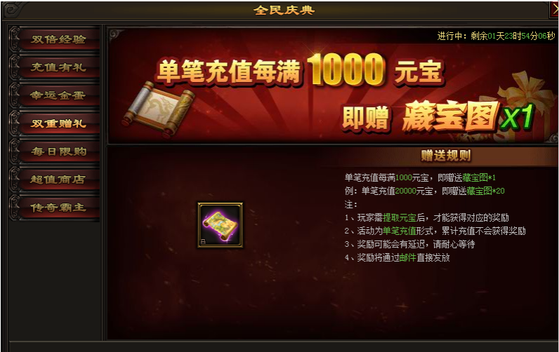 活动内容:活动期间,单笔充值每满1000元宝,即赠藏宝图*1,多充多送哦!