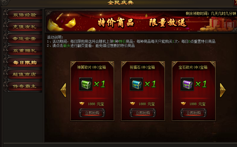 活动内容:活动期间,每天都可以购买到超值折扣道具,机不可失!