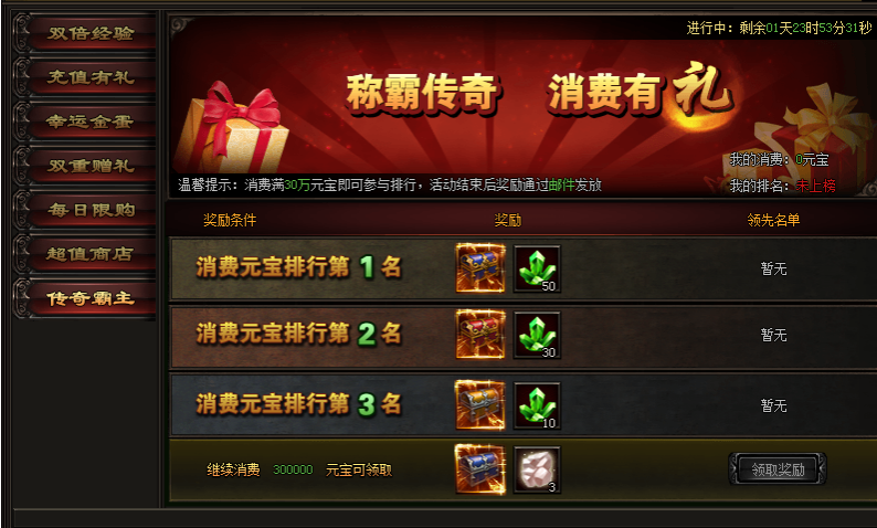 活动内容:活动期间,消费满30万元宝即可参与排行,活动结束后,奖励通过邮件发放。