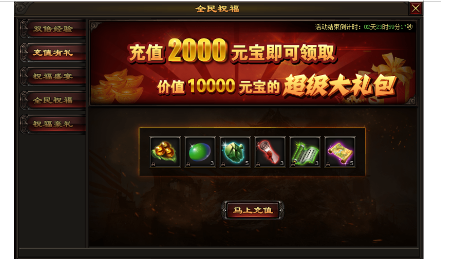活动内容:活动期间,每天充值达到2000元宝即可领取对应礼包奖励